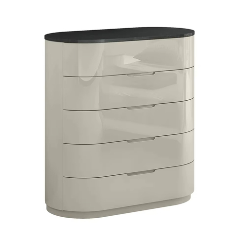 Nouvel arrivage de commode moderne en bois blanc avec 5 tiroirs et plateau supérieur ovale très brillant pour le rangement de la chambre à coucher et le salon